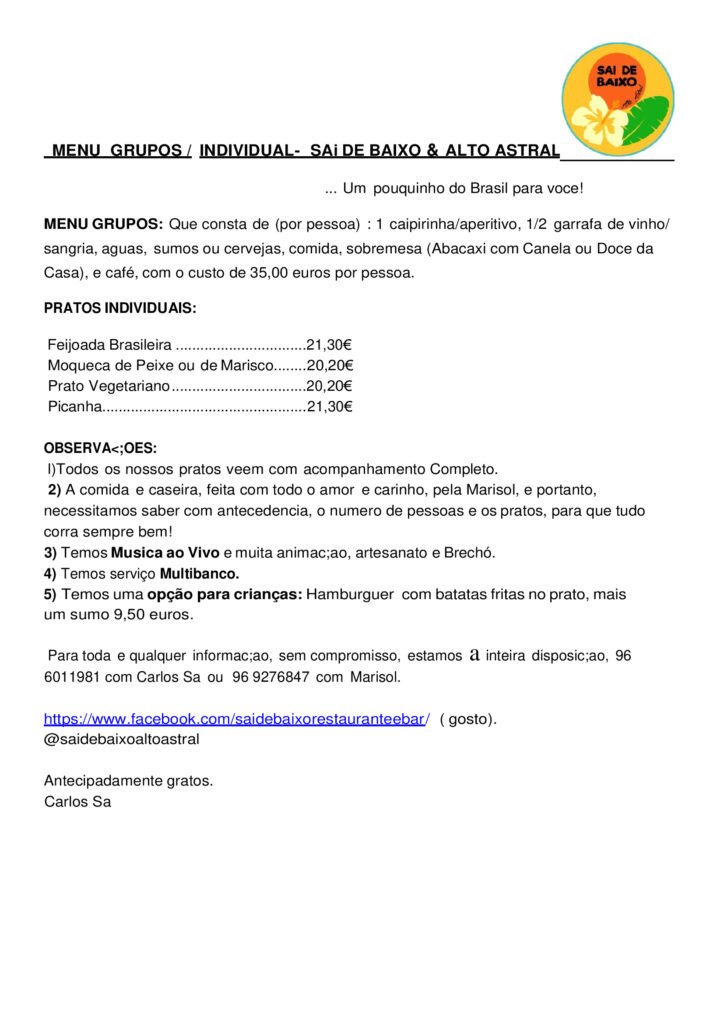 MENU GRUPOS : Que consta de (por pessoa): 1 Caipirinha/Aperitivo, 1/2 Garrafa de vinho/sangría, aguas, sumos ou cervejas, comida, sobremesa (Abacaxi com Canela ou Doce da Casa), e café, com custo de 35,00 euros por pessoa.