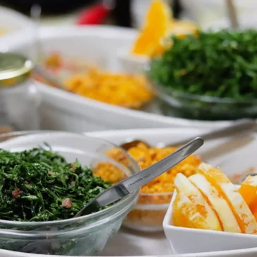 Um banquete brasileiro com couve refogada, farofa crocante e fatias de laranja, essenciais para uma experiência culinária completa e deliciosa.