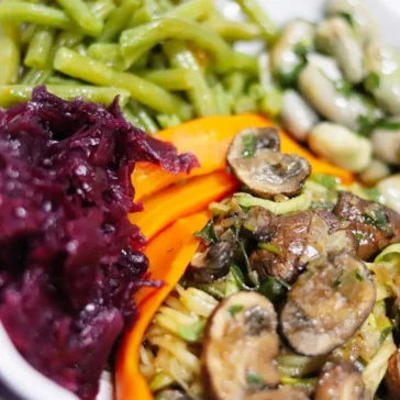 Uma composição colorida e saudável de vegetais frescos, incluindo beterraba, feijão-verde e cogumelos salteados.