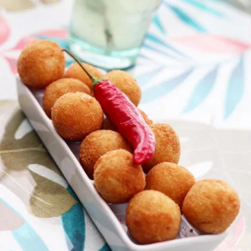 Bolinhos fritos e crocantes, provavelmente de queijo ou carne, acompanhados de uma pimenta vibrante e uma refrescante caipirinha.